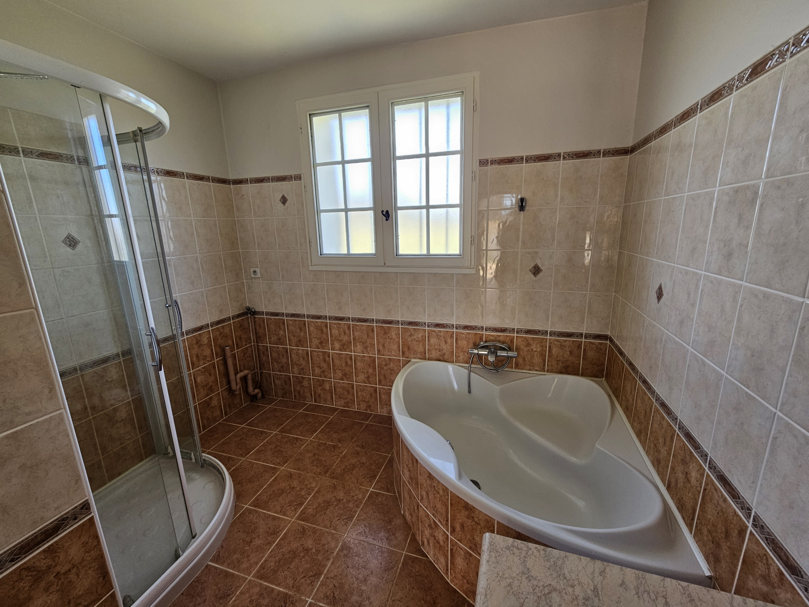 Maison de plain pied de 140m² comprenant un salon/séjour, une cuisine séparée, 3 chambres, une salle de bains avec baignoire et douche et un wc indépendant.